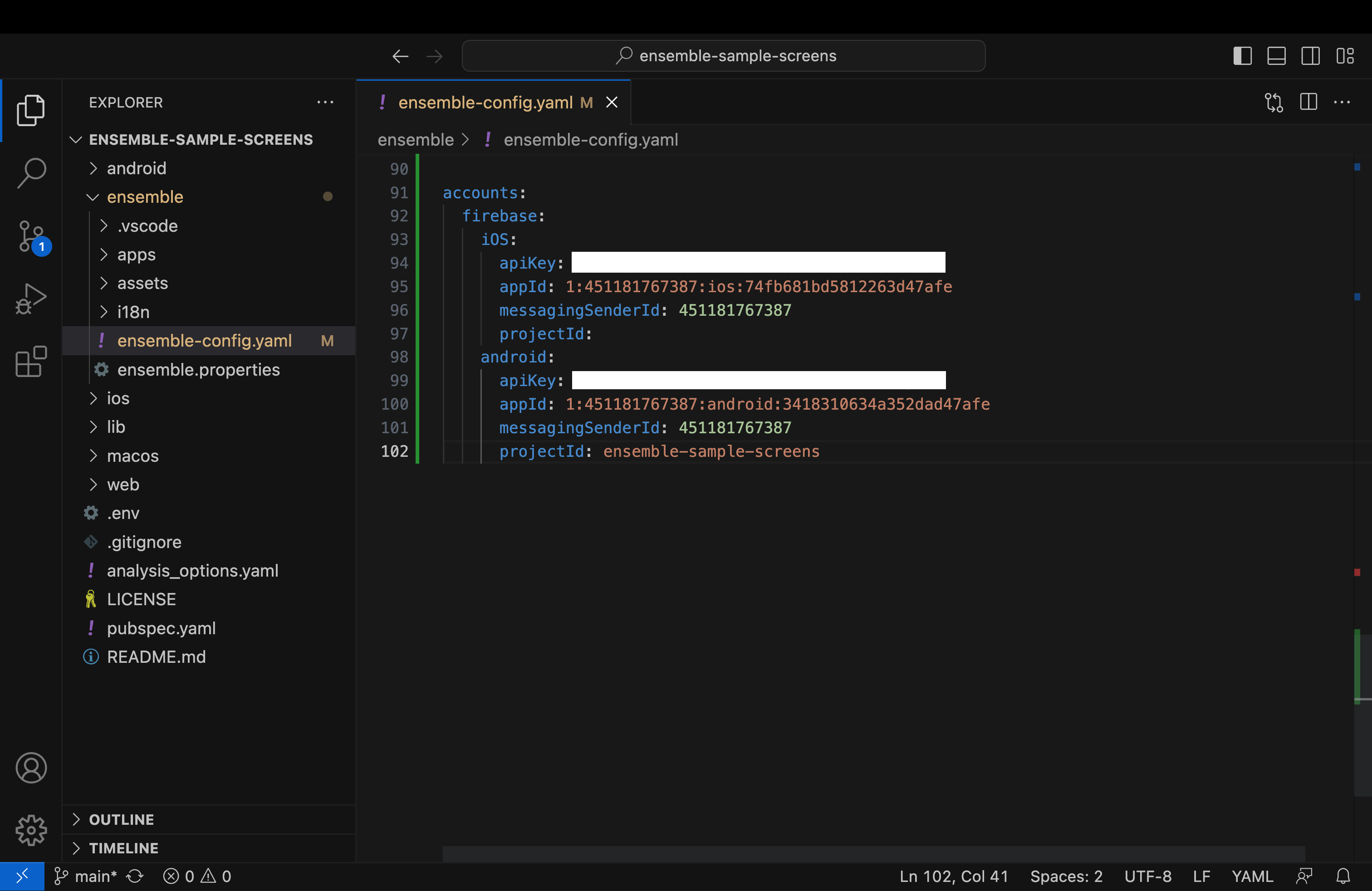 In the same file, ensemble-config.yaml , add Firebase account details in the following format.